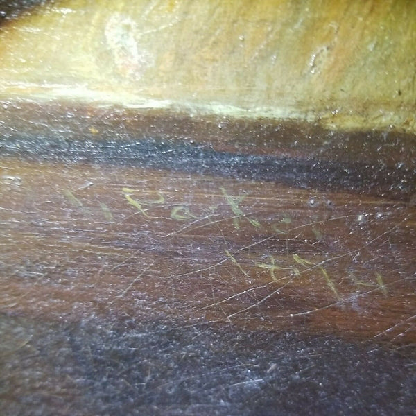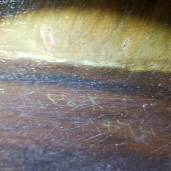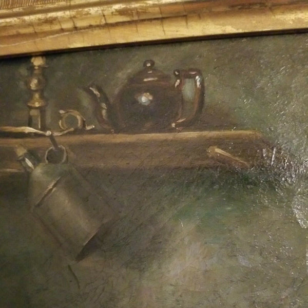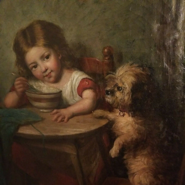 A circa 1874 museum quality antique original painting of a little girl eating her supper with her dog by her side. Absolutely an exquisite and detailed oil painting masterfully painted by the artist signed and dated on the chair lower right portion of the painting. The signature is illegible but the date of 1874 is clear. The painting is in very good overall condition, with the frame also looking original, showing the same age as the painting. Original canvas showing some repairs on the back and consistent aging. The canvas is very high quality which is indicative of the work of better artists of the period. Antique handmade nails used to nail the painting to the stretcher. Friends, I have seen similar quality Paintings throughout the years at the better NYC antique shows selling for over $20,000, it is that kind of a painting! The frame has some minor restorations as well as light scratches and minor chips, guaranteed to be from 1874 (almost 150 years old), original!