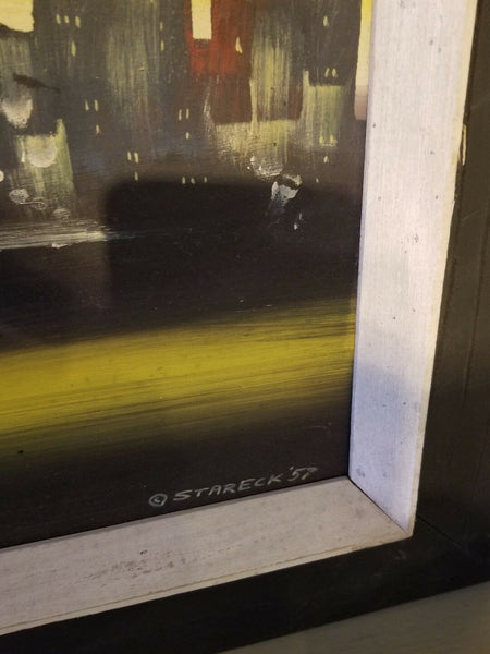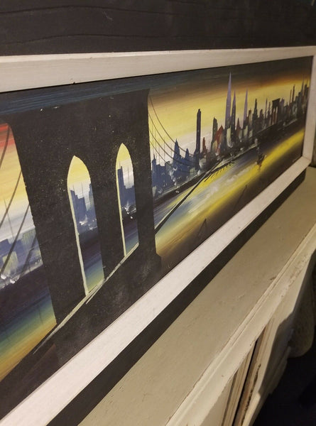 An iconic new York painting depicting the famed NYC skyline with bridge view in all original condition with its ebonized grace with paint decorated dimensional architectural wood liner signed and dated lower right with a realistic sunset nightfall with the empire state building, Chrysler building as well as the complete NYC skyline as it was in the 1950's. Measuring 45" wide by 17.5 " high.
