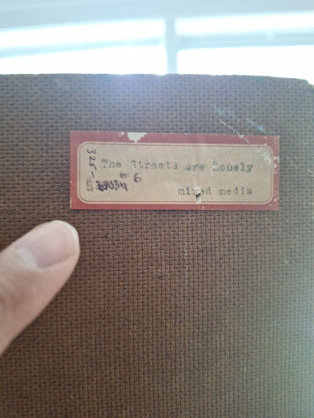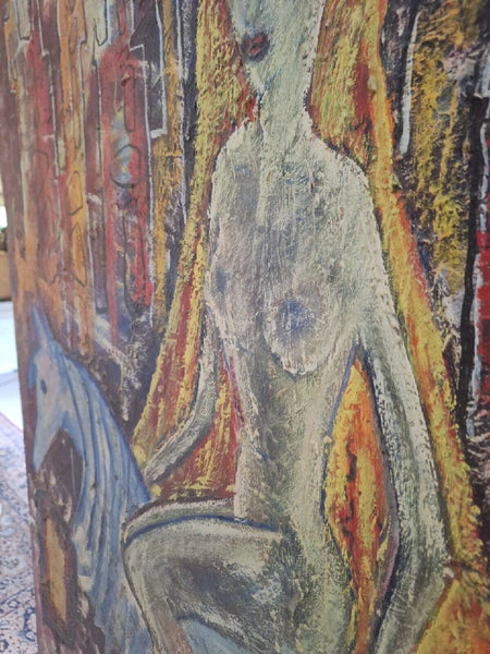 A surrealist original mid century modern painting depicting a Nude Girl on a magical horse in a cityscape. This is a period correct mid century modern era painting in all original condition with natural normal wear on the corners consistant with age with no paint loss Signed and labeled on back. Mixed media 100% hand painted original. With original label with title and a price tag of $325 from 1960's which is equivalent to $3250 today. Please contact me as I believe this is an important 20th Century work of art. Never framed. Impressive Provenance provided upon request.