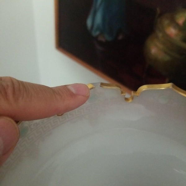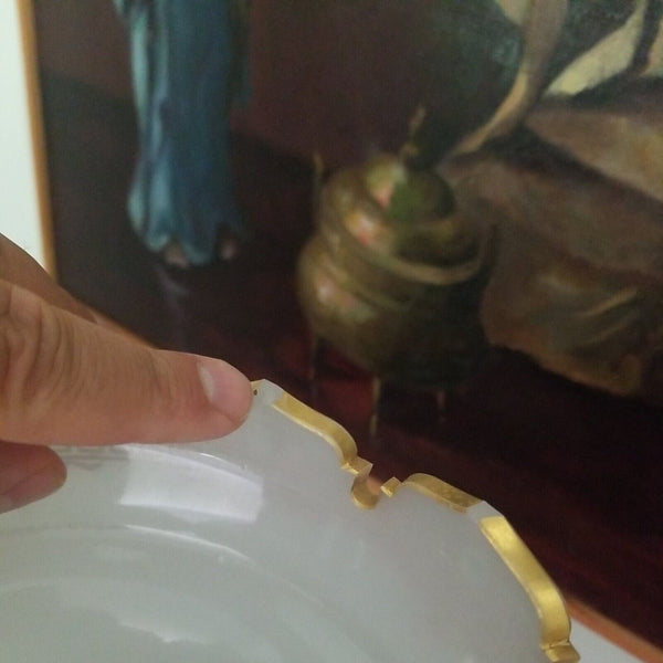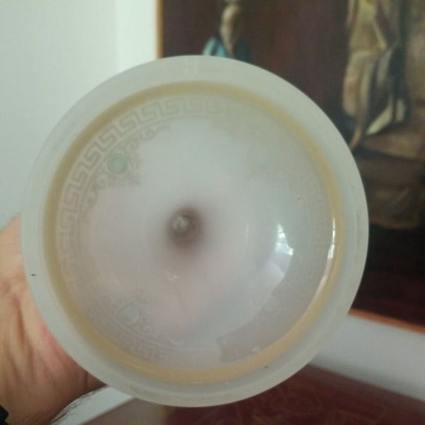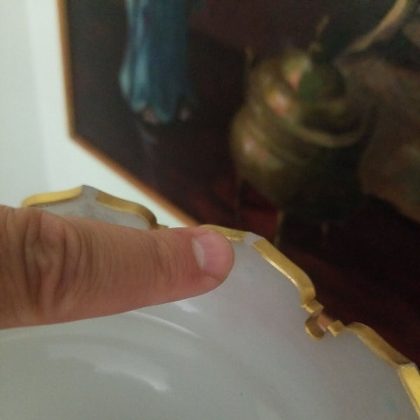 An over 100 years old guaranteed French opaline jeweled Baccarat and 24k gilded gold centerpiece. The finest of antiques Baccarat glass indicative of the emerald green large jeweling and cabuchon which are amazingly there nothing missing. With rich gold 24k hand applied and painted Greek key design. This is a rather large piece because it is heavy because of the large emerald jeweling and gold work in a brilliant opaline. Has 3 Small chips as I point to in my images. No cracks or restorations. The glass opaline is in all original condition. No gold wear and no lost emerald jewels.