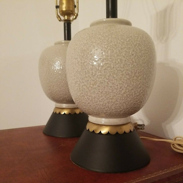 A unique pair of diminutive 1950's mid century Modern designer Lamps. In all original condition with all all the original hardware in tact and in working order. Fantastic composition of French ceramic body with a stylized base and scalloped inverted bronze based on top of the ebonized metal pedestals. Absolutely high quality hardware and studio ceramic with a designer's touch in putting these lamps together. Friends, I have never seen Lamps in this unusual size rather diminutive yet they make a tremendous amount of decorative impact with all the components being integrated as such. The gray greenish ceramic porcelain glaze body of the lamps is textured no cracks, breaks, or restorations. Marvelous feel when you run your hands on the surface of the ceramic lamps and feel the textured pattern. Just look at how much care was given in the Finials that screw in at the top of the lamp: simply artistic all around.
