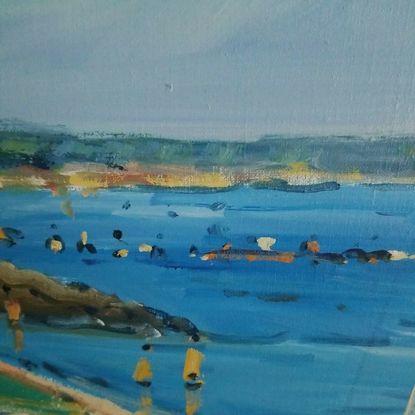 A vintage oil painting of a fantastic, happy beach scene what looks like the French or Italian Riviera- has a very Albert Marquet French Riviera feel to it.  Painted with a profusion of colors vividly painted by the master artist with many, many figures painted with correct scale, all in an impressionistic manner.  Original gilt frame with linen mat.  In pristine condition all around.  Some figures appear to be nude as is the custom in exclusive European beaches.