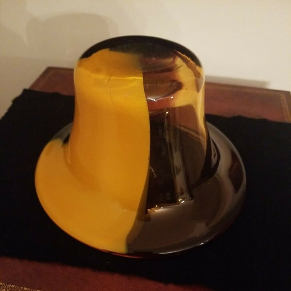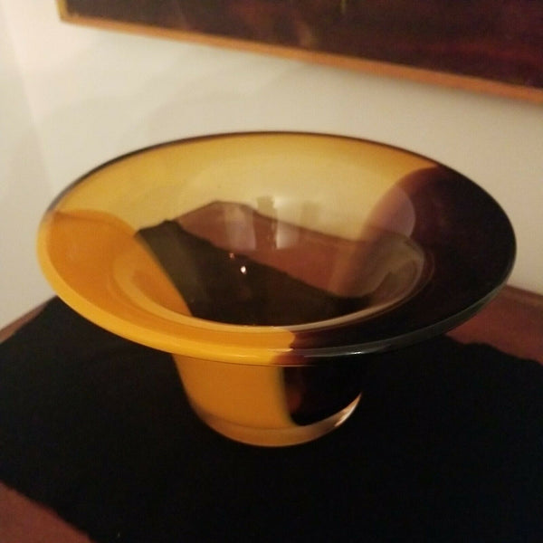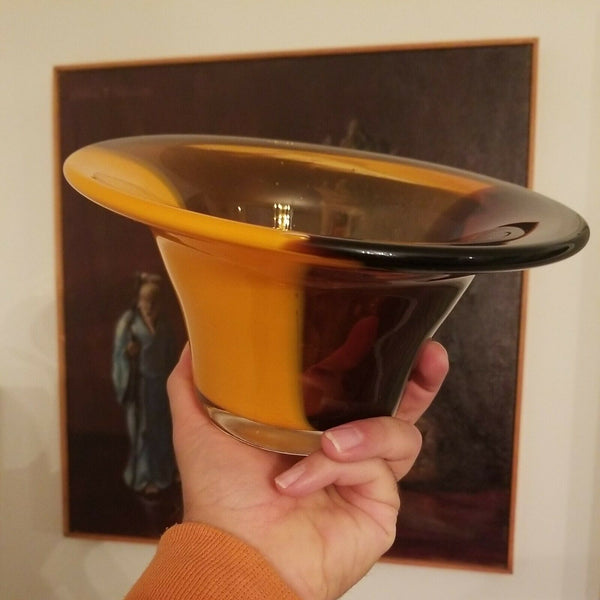 A superb vintage art glass centerpiece circa 1970's in brilliant clear amber and hermes orange internally decorated color. Thick glass, cone shaped but wide with a heavy feel. No breaks, chips, or cracks. Clear glass. Showing off its abstract design of hermes orange and dark and light amber.