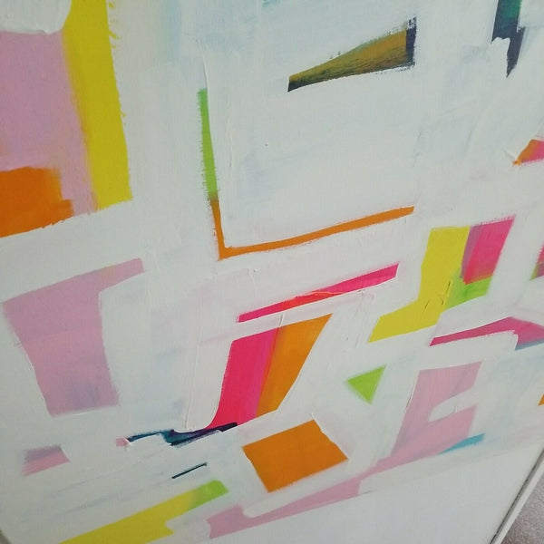 A fine contemporary abstract painting purchased from a Hamptons, LI, NY estate signed and titled on back stretcher. Having a modern art style of abstraction popularized in the 1950's mid century Modern art. Happy colors come together in abstract formations with Hermes orange with pinks, canary yellow, avocado green, and sky blue color fields. Friends, this painting was in storage for a few years and the back wood strecher bent as I point to in one of my images is damaged but there is no damage to the canvas and the painting is bent so selling as found.