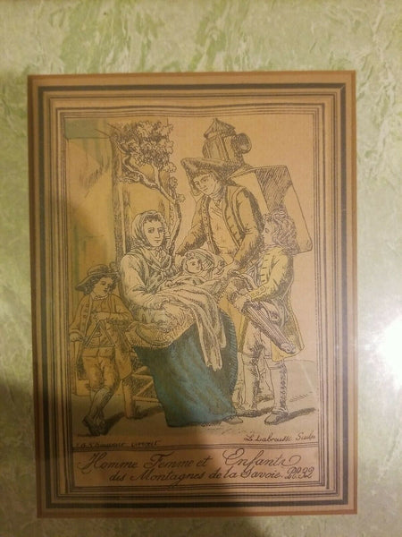Framed Engraving by Jacques Grasset de Sainte Sauveur and Labrousse titled "Homme Femme et Enfantr des Montagnes de la Savoie". It was done for Sainte-Sauveur's c. 1797 publication Costumes de different pays.