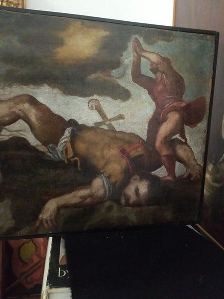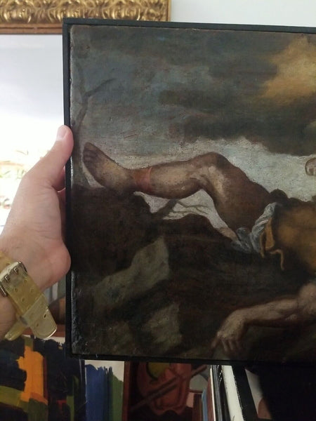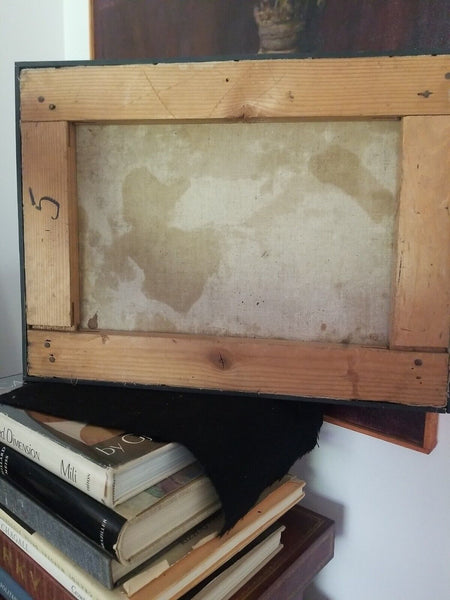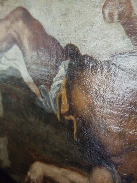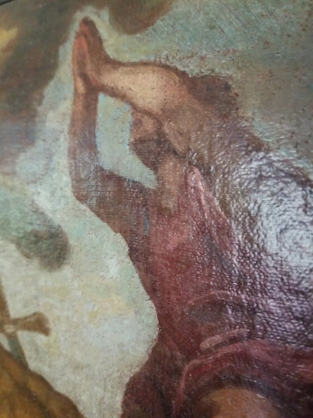 A true antique original painting.  Hand painted, about 300 years old.  Looks like it had conservation and restoration.  Overall good condition. Solid.  Obvious craquelure given age.  Needs professional cleaning.  Has antique appeal.  Old hand made nails holding the wood stretcher, good for an antique painting.  From an Estate in a long island gold coast Estate including: