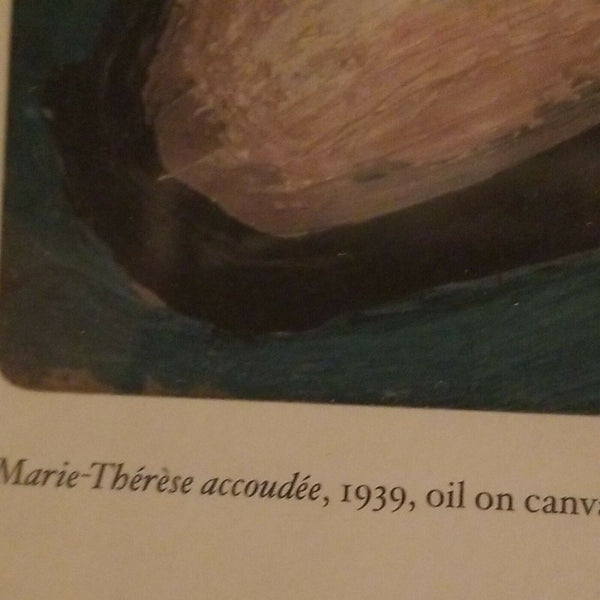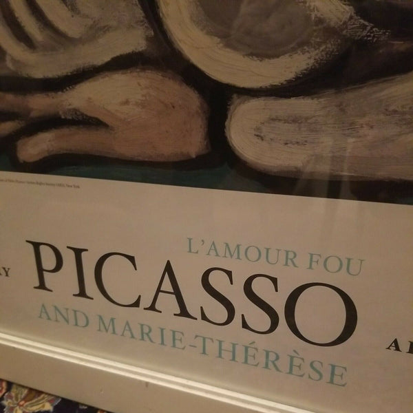 A Large original gallery poster first strike, clear and crisp, Lamour Fou Picasso and Marie Therese, Gagosian gallery. The poster is in mint condition. It looks so good, it is like a water color painting under glass but it is a poster after all. Quality paint decorated white frame (frame shows some chips at corners and some scratches). Glass is in mint condition. Again, the poster is strikingly crisp and colorful.
