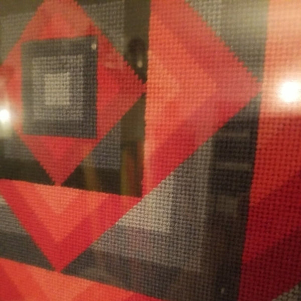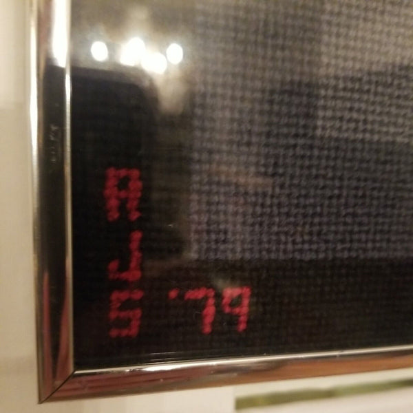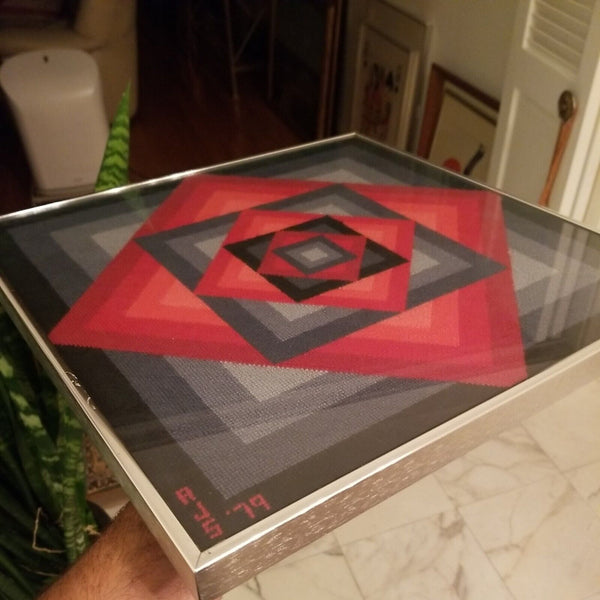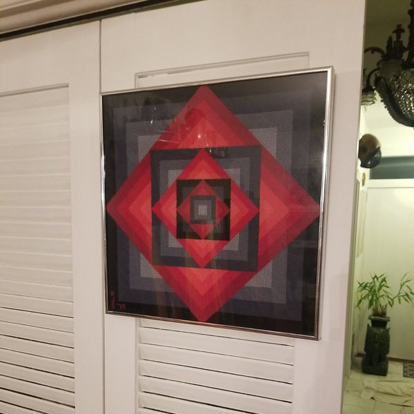 An original abstract expressionist geometric 3 dimensional all hand made Signed and dated abstract art framed in an expensive manner with a designer chrome frame of the period nice and tight with its original glass. Rich colors with salmon pink to blood red and orange with navy blues and sky blues juxtaposed to make it look 3d in a very appealing and important looking artwork. In all original condition. Signed and dated lower left. Some light scratches consistent with age. Note: studio gallery custom frame. From a collection of abstract art that included: