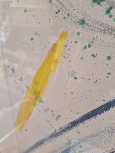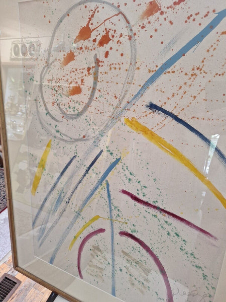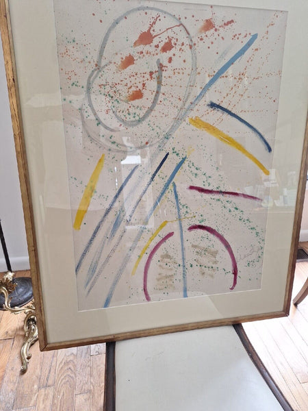 A very well done abstract oil drip water color painting signed and dated lower left vintage original in its gallery gold leaf gilt wood frame (the gold leaf frame now showing natural discoloration consistent with age, minor scratches, normal wear for 40 years old). The style of this magnificent artist reminds me of Sam Francis as well as Jackson Pollock as well as other major mid century modern abstract Expressionist like