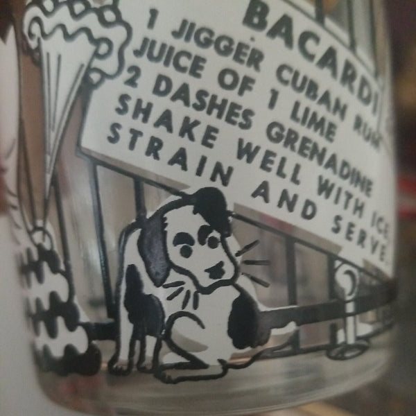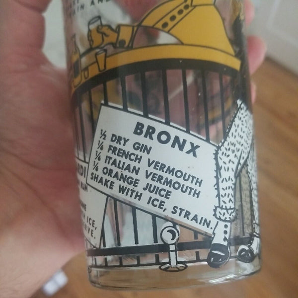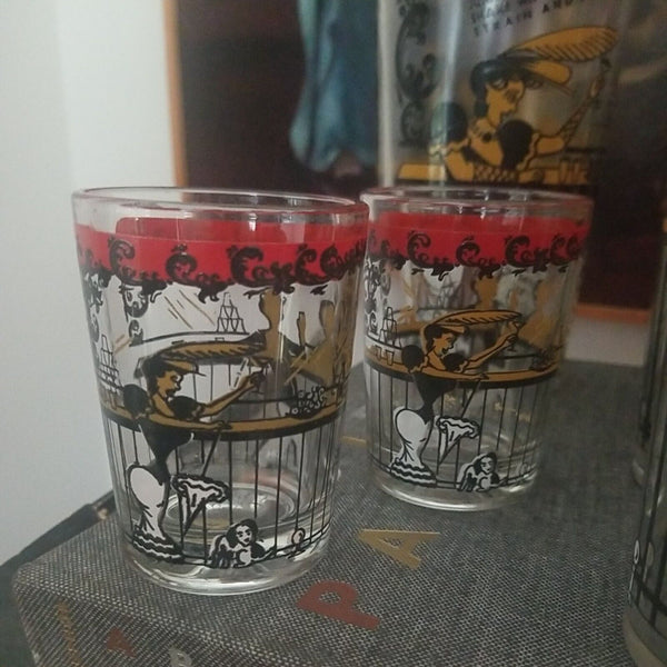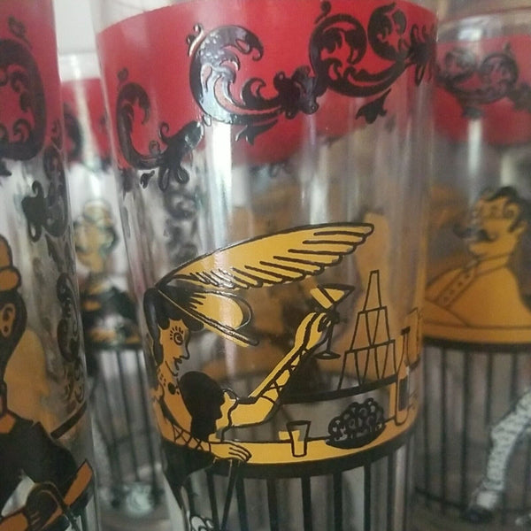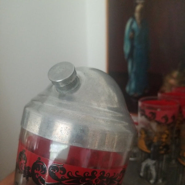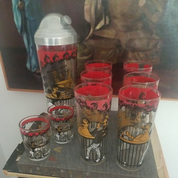 Consisting of 6 tall glasses, 2 short glasse, and a 10.5" tall large cocktail shaker with its original chrome domed cover and even its original screw in cap. Simply amazing!! Multiple cocktail drink recipes in raised graphics on the cocktail shaker including: