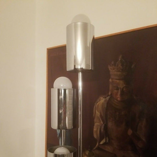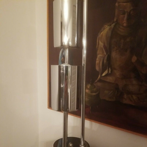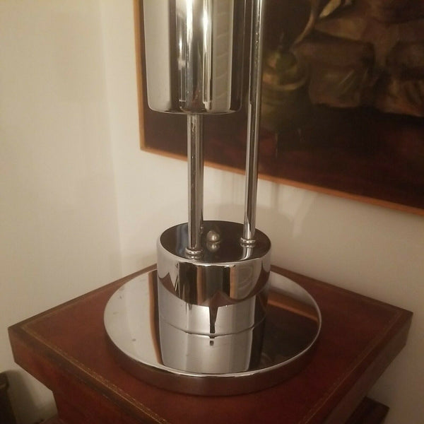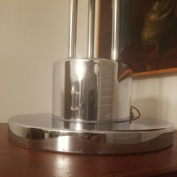 A superb large sculptural polished chrome vintage 3 way lamp circa 1970 of designer quality with superior thick chrome with a mirror like finish. The lamp works 3 way where you can select how many lights you can have on or off. Friends, this lamp has its original expensive chrome plating never having been resurfaced. There is minor staining on the chrome base, which shows its original finish and authenticity. More importantly, there is no weathering or pitting of the chrome. Smooth and reflective like a mirror. Looks like new but it is vintage. Amazingly preserved. Similar examples for sale on decorator websites sell for several thousand dollars. Please note that if you have Milo Baumann furniture or Karl Springer, Sarfatti, Paavo Tynell, or even George Nakashima furniture, this goes perfectly with that type of decor.