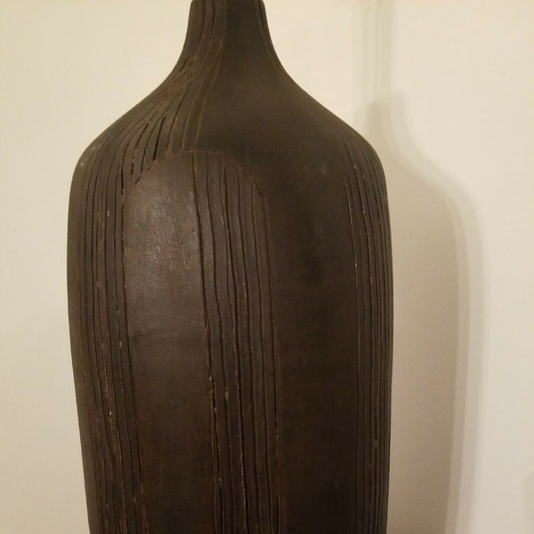 A fine original iconic form mid century Modern Danish lamp.  Nicely aged being over 70 years old with the patina now showing natural fading.  Hand carved minimalist modernist designs in linear fashion on the ceramic.  Friends, I could see this lamp perfectly situated on a Knoll Eames table next to Finn Juhl chair.  It has the look that is iconic with designer mid century furniture and art such as Vladimir Kagan, Edward Wormley,  Warren Platner decorations.  This lamp came from an estate with objects from the mid century time period with artists and designers as I mentioned.