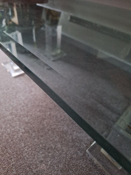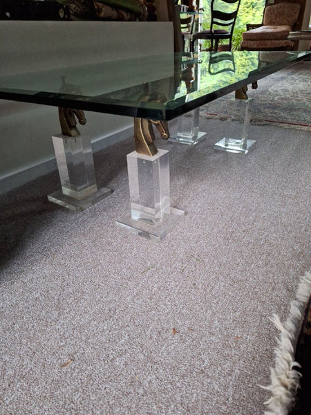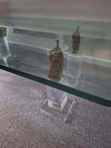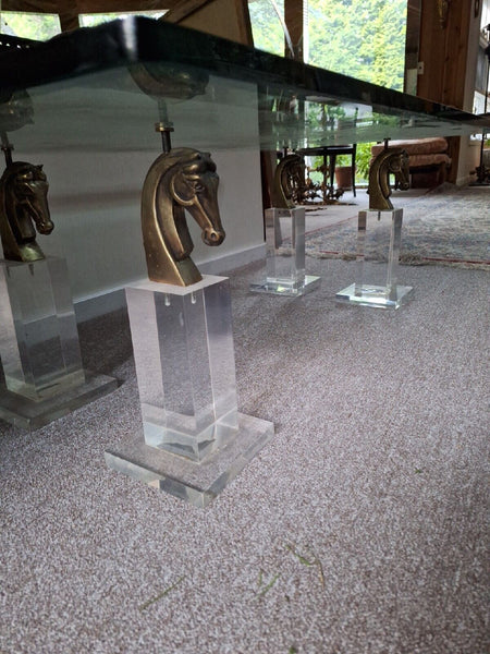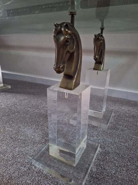 A vintage original high designer all original mid century modern period correct cocktail or coffee table having cast bronze organically and naturally horse head figures on designer lucite bases much like a giant chess board knight.  Four bases supporting original 1 inch beveled Italian glass.  Purportionately correct.   With the right scale, making it the quintessential art form cocktail table.  Much like a  fine French bronze Sculpture or modernist work of art like Brancusi or Giacometti. This table is a work of art with a timeless style and high decorative nature.