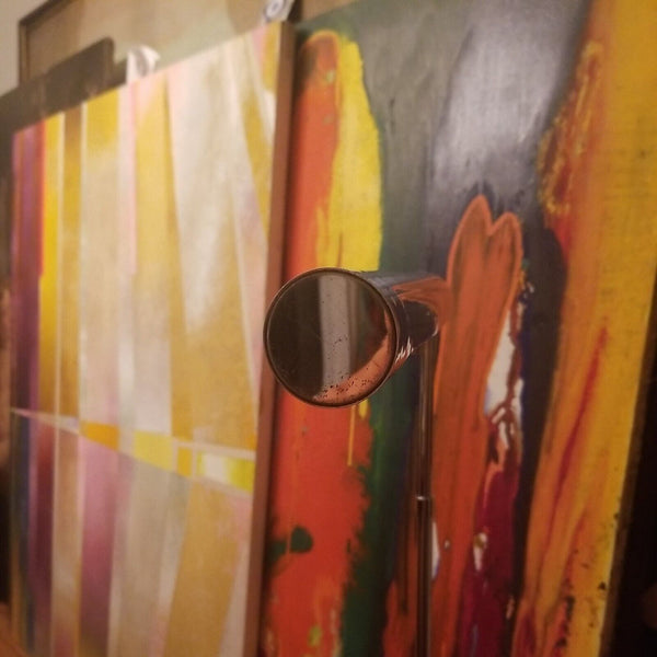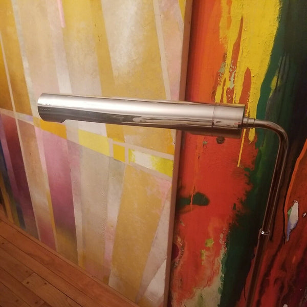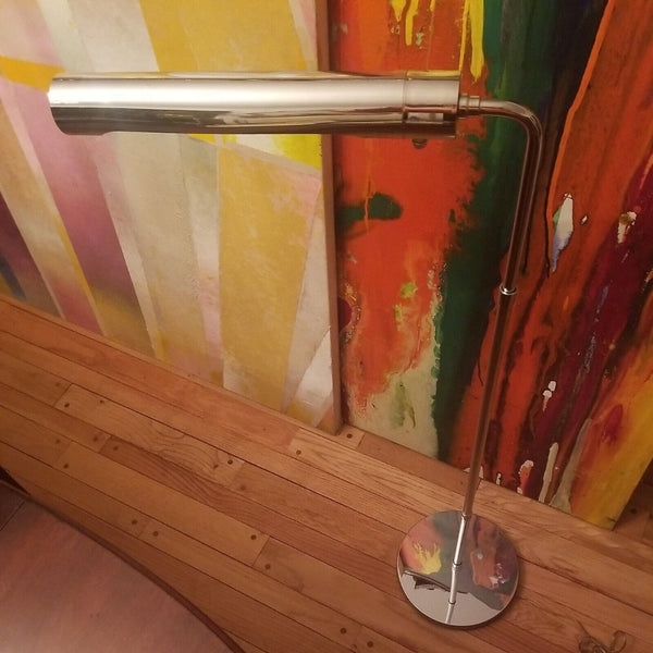 A very fine vintage high quality designer Chrome lamp with an adjustable height feature. Looks similar to Jonathan Adler but predates it and higher quality with a cleverly hidden switch underneath the head close to the bent rod. Very minimalist in style. The height is adjustable when knob is twisted. Hi quality triple Chrome plating. Now somewhat tarnished but retains its shine now subdued for the correct and authentic mid century look. Wear consistent with age. Minor very light scratches. The dibs and Chairish have similar items for over $3000.