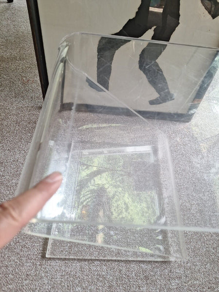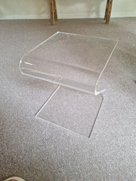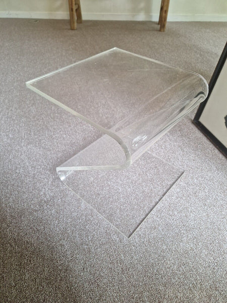 A rare vintage original mid century modern circa 1970's sculptural z shaped abstract side table drinks table.  Thick high quality lucite invisible looking (not cloudy)  much like the superhero wonder woman's airplane nice and sturdy good weight.  Attributed to Laverne, a highly regarded lucite furniture designer.  Some light surface scratches.  On the bottom of base consistent with age.  No breaks or chips.  For various decorative purposes.  Even as a focal point as objet d'art.   Can be integrated with furniture made by designers like: