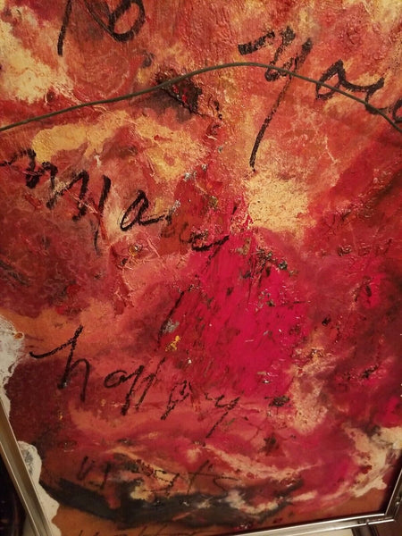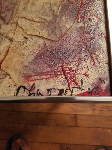 A museum quality double sided Abstract expressionist in all original condition with original period frame designer Chrome with artist dedication on back. Double signature on front lower portion. In original unadulterated condition. Rare color Combination. Exaggerated artistic oil drip design reminiscent of Jackson Pollock.