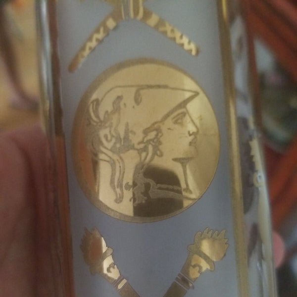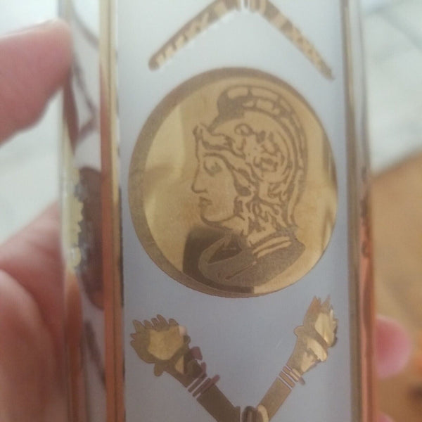 A mint condition never used new old stock set of 8 Hollywood regency mid century Modern glasses. The ultimate in barwear, a complete set of 8, with heavy gold, Roman gladiator classical figures embossed in raised gold on each glass with Neoclassical decoration. No gold wear. No breaks or cracks. Very decorative. Rich raised gold. Brilliant clear glass.