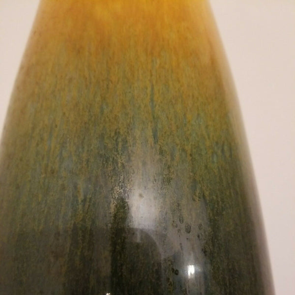 A magnificent original mid century Modern ceramic glazed iridescent lamp in all original condition with the actual brass base from the 1950's (original brass base now nicely tarnished and shows age discoloration making a wonderful antique patina). Friends, this is an oversized lamp with the body of the lamp alone measuring 29" tall. The colors of the ceramic almost have a translucent quality with chartreuse and sunset yellows mixed in. The ceramic is in all original condition with no breaks, chips, cracks or repairs. Quality hardware signifies that this was an expensive art ceramic lamp in the 1950's and not a commercial grade lighting. Studio quality, original mid century. In good working order.