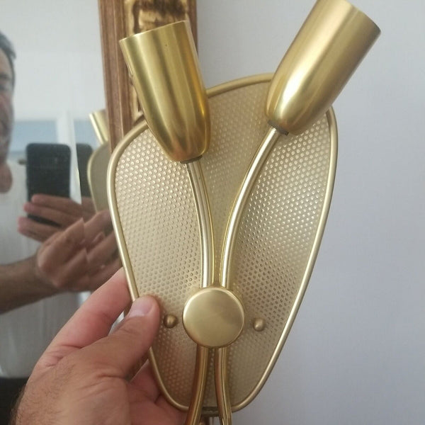 A rare pair of 1950's original never installed pair of abstract sconces. Absolutely amazing that it has never been used, retaining original working wiring. Stored in a climate controlled facility. This is the iconic mid century Modern highest quality lighting in an asymmetrical abstract form. In all original condition even retaining its original linen pull strings with a beehive woven bottom part. Original gilding intact. Perfect for a decorative setting which I believe will very well complement: