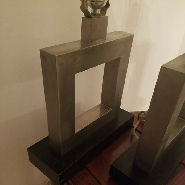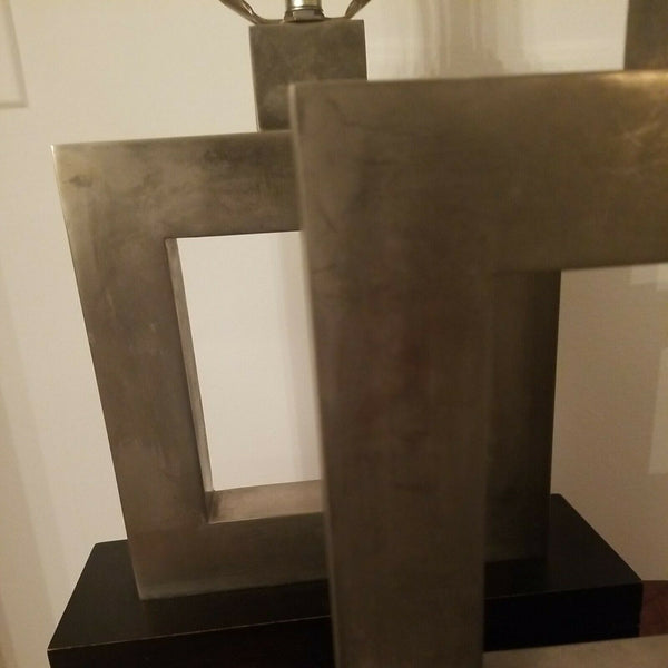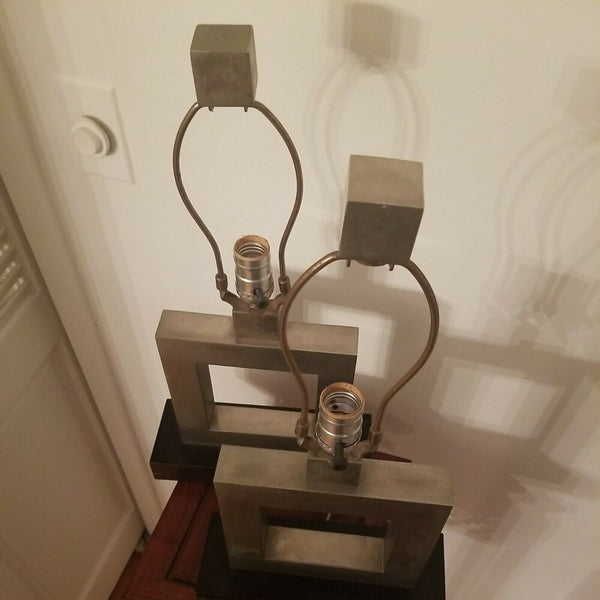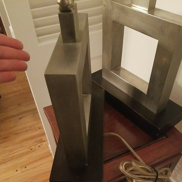 A rare pair of 3d Cubist heavy chrome lamps. An original pair in working order rewired sometime after the lamps were made during the mid century era. Great vintage patina now with the chrome naturally tarnished giving it the antique patina you want to see in original mid century accessories for the highest in interior decor. Can be polished if desired.