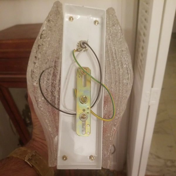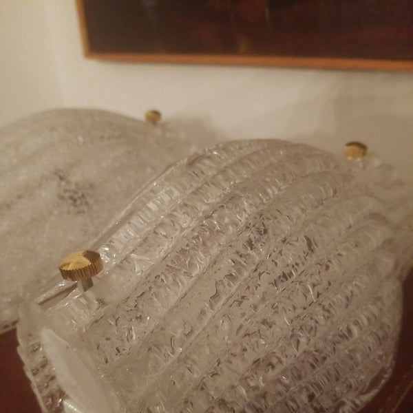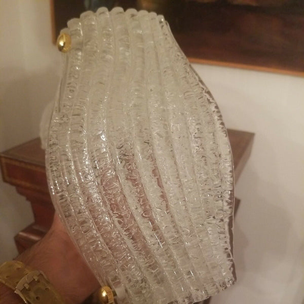 A very decorative quality thick stylized crystal probably Italian pair of sconces or wall lights having been rewired and ready for installation.  Quintessential mid century Modern Hollywood glamour style.  An interesting waterfall crystallized design.  Thick crystal with deep ridges giving a maximum decorative effect.  Polished gold plated original screws. No chips cracks or breaks.  A brilliant effect in the crystal.  A clean pair perfect for any decor.  Similar pairs on decorator websites sell for $10k.