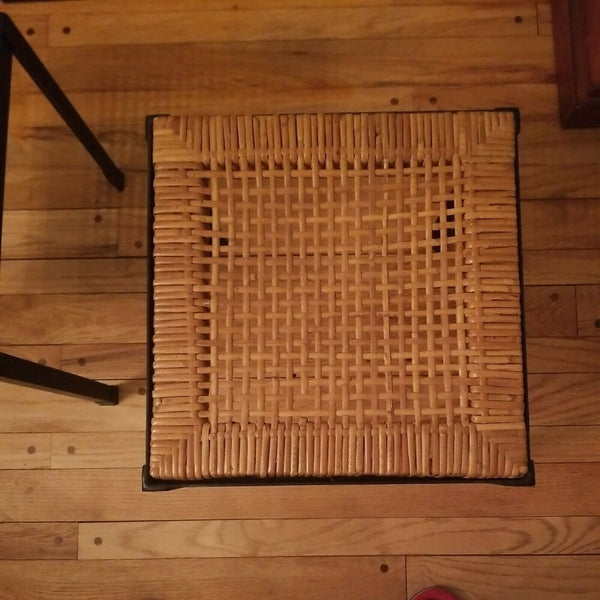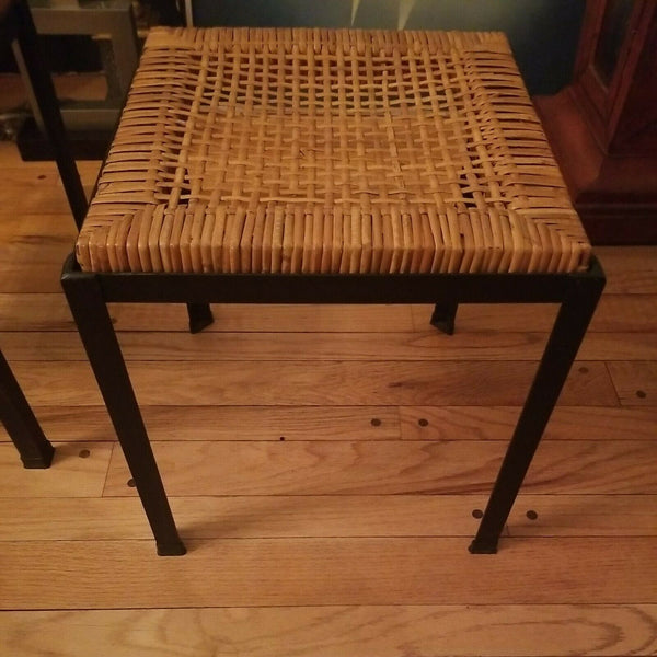 A real genuine pair of designer ottoman stools from the 1950's.  One of Danny Ho Fong's iconic designs, these Ottomans are from the period and correct in every way with their original wicker tops.  Very rare:  the original tops match the base! In very good overall condition with the metal showing some wear consistent with age and the wicker having a few strands on each stool disatached on the sides with normal wear and a few other loose strands on the sides of the tops but overall a magnificent decor from the mid century period.  Friends, the designer quality with the master craftsmanship such as the corners of the metal work having been applied so perfectly and seamlessly typical of the work of the master designers of the 1950's.  Note: although the wicker is solid and mostly intact and original almost 70 years old, I would not recommend sitting on these stools, the fine wrought iron bases on the other hand, could support the weight of an elephant if need be!  The tops look to always have been meant for decorative purposes.