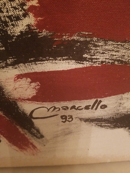 An important museum quality painting worthy of being displayed in the moma museum of modern art signed in stylized manner "Marcello 93". A rare vintage Abstract expressionist painting. The colors and brushstrokes are reminiscent of the master Franz Kline and Abstract expressionist artist Willem de Kooning.