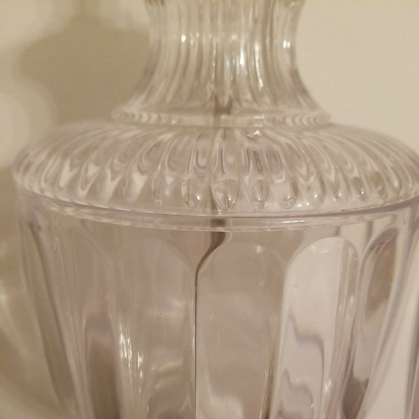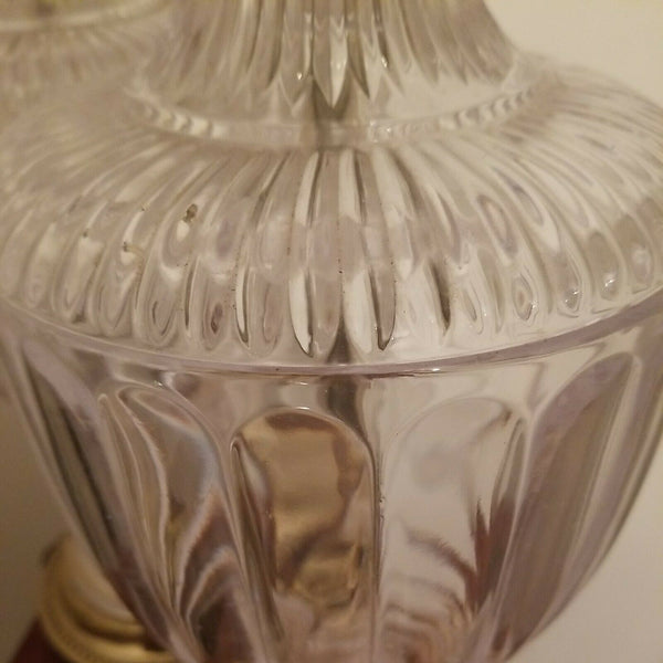 A fine mid century modern pair of clean Baccarat urn form lamps having a classical form a perfect matching pair with the crisp brilliant French crystal molded glass urn form. The high quality is evident in the multi sectional construction where the body of the lamp is separate and the top piece is connected all original held together in its lamp assembly. Original gilt bases now slightly tarnished in good working order. The glass urns themselves are 16" tall and have a big feel abd and bulbous. No breaks or chips in the glass.