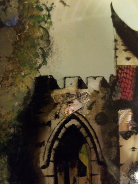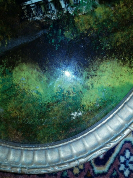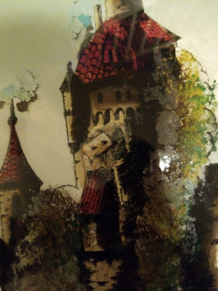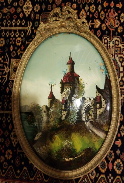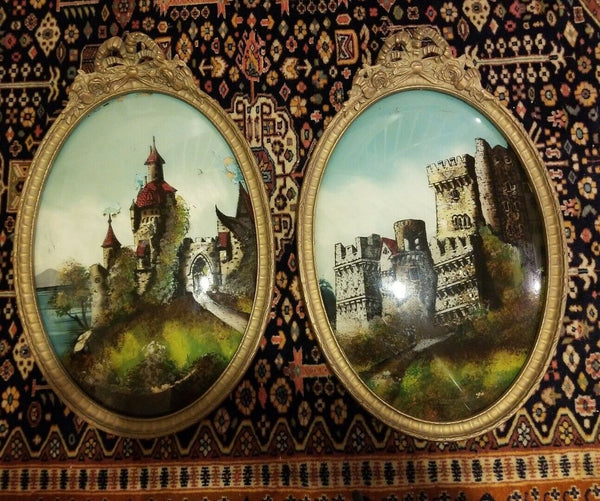 Pair Of Framed Oval Convex Glass Paintings of Castles IMPERFECT CONDITION SEE PICS!
