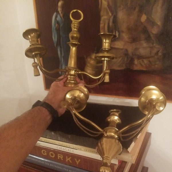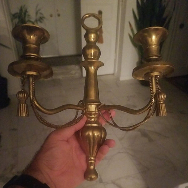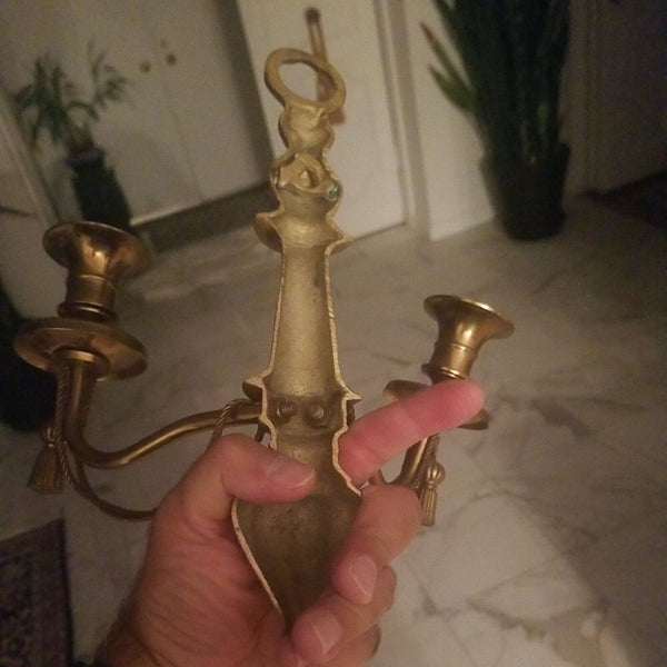 A vintage original matching pair of a high quality extremely decorative rope and drop tassle design gilt Sconces having never been wired but can be if desired with the original gilt gold finish patina now nicely tarnished and showing wear consistent with age with stylized bobeche candleholders and a classical urn form body. An original pair with its original patina. Naturally antiqued surface. Great to hang purely decorative reasons. Also great with candles or may be wired to meet lighting needs.