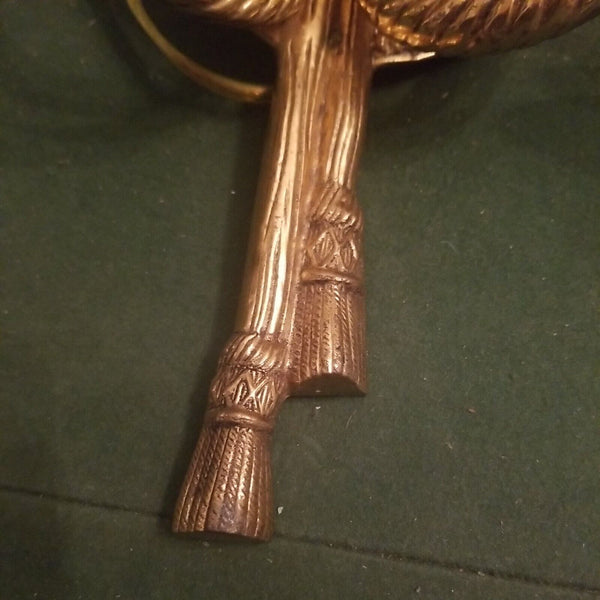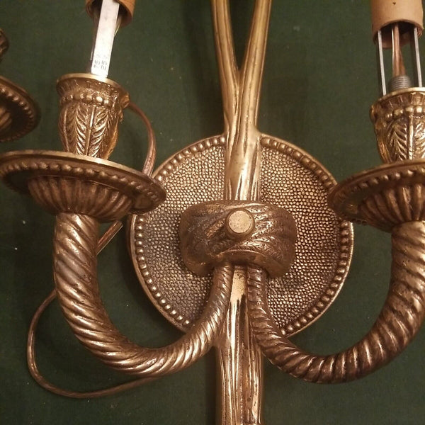 A fine pair of Hollywood regency mid century Modern gilt gold bronze rope twist style Sconces. The original gold patina now wonderfully tarnished And distressed, consistent with age. Naturally antiqued. Tremendous decorative workmanship. Tassel design naturally flowing. Flower ribbon top forming loop. The gold is just right, not too shiny. Sophisticated antique look. No breaks or cracks or restorations. Recently rewired. Measuring: 15" high x 8" wide.