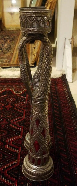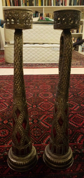 Pair of Tall Metal and Red Glass Indian Candle Holders.
