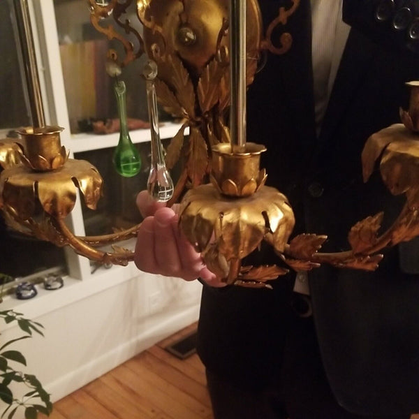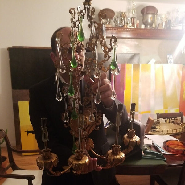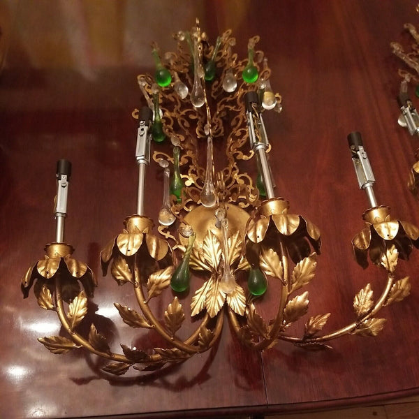 A highly decorative original gilt gold large 27" highy pair of Hollywood glamour Sconces. All original with original gold gilding with tear drop prisms and hand formed organic leaf decoration. Large size indicates that these Sconces were made in limited quantity for larger affluent homes and special ordered probably from Italy. Four tall light sockets on each sconce. Please note that this pair of antique Sconces can possibly attributed to Maison Bagues because of the exquisite quality organic form and gilt gold ormolu. Wonderful antique look. Tarnished consistent with age, desirable antique look. All Crystals in good condition. No breaks, with newer wiring. Similar examples can be seen on major decorative websites with asking prices many times this price.
