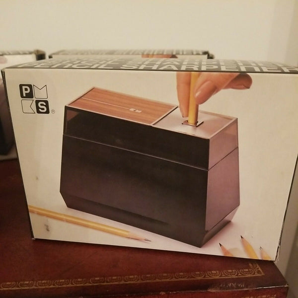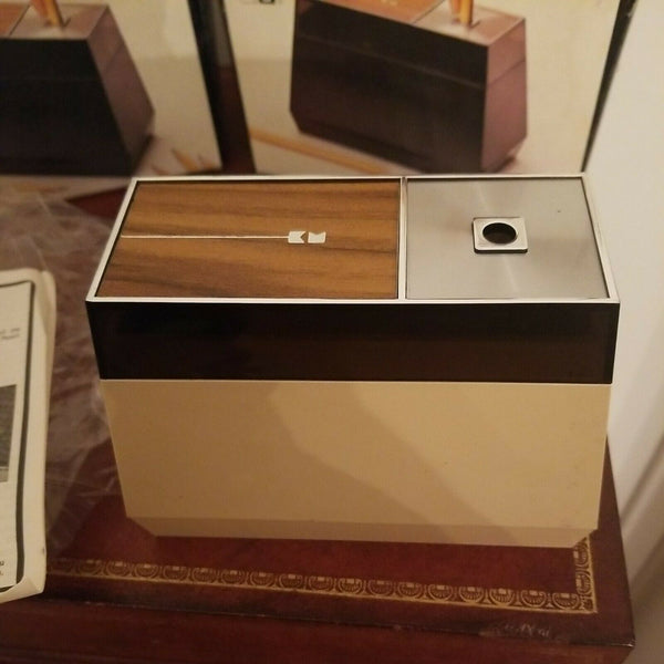 A rare vintage 1970's unopened in original box battery powered pencil sharpener (Battery not included). Having iconic mid century Modern design complete with faux wood and chrome decor much like you would see in a vintage 1960's sports car. Complete with original cardboard box ( the boxes show wear) includes instruction manual. In original plastic wrapper. A very rare and unusual, in working order, collectible/ decorative.