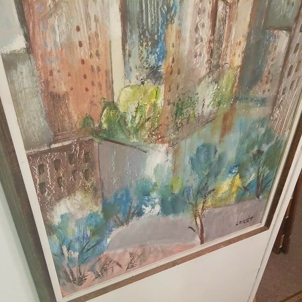 A large and impressive 1950's mid century impressionist painting. Having soft pastel colors showing the breathtaking New York City skyscrapers in impressionistic style. Original period dimensional wood frame and artist painted liner. Frame showing age. Painting in all original condition.