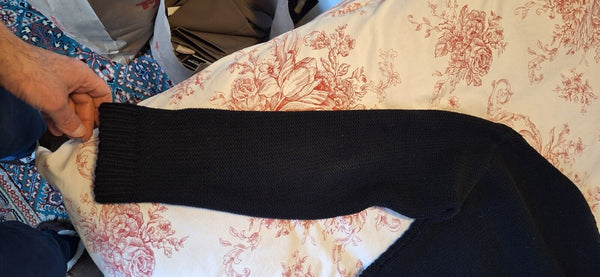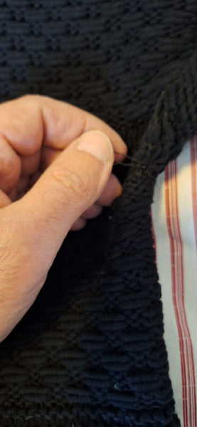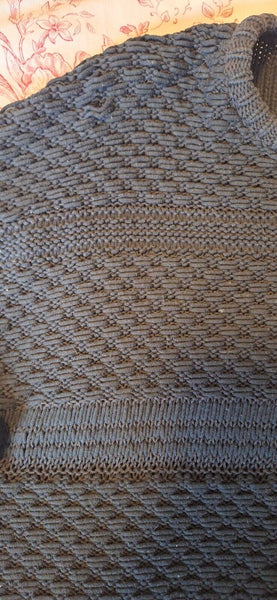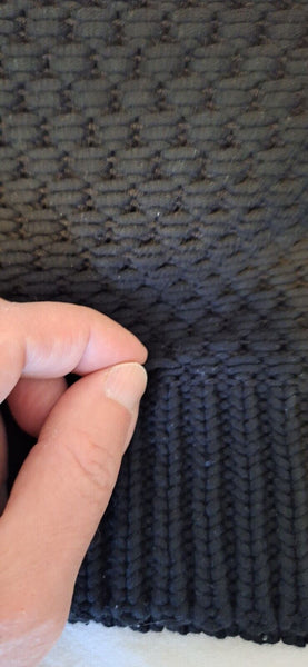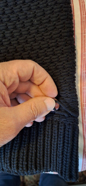 Because this sweater is knitted or woven, the knitting has gotten loose in some areas, see pictures. Maybe a seamstress would be able to fix it.