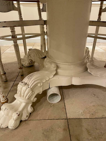 This is actually 2 items: a white table and a granite top. You cannot see the top of the white table in the pictures. The granite top was matching the countertops in the kitchen so it was placed on top of this white table (it is not attached). Eventually, the weight of this granite top caused the crack you see in the bottom of the pedestal. This crack does not go all the way through. A cylinder was placed underneath the pedestal to prevent it from breaking. So far it has done the job (it has been there 5 to 10 years). However, if the cylinder was removed, we believe the crack would get worse and would break.