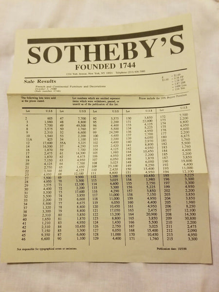 Sotheby's New York Auction catalog Featuring French and continental furniture and decorations Saturday October 01, 1988