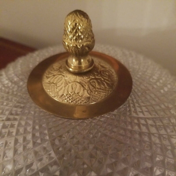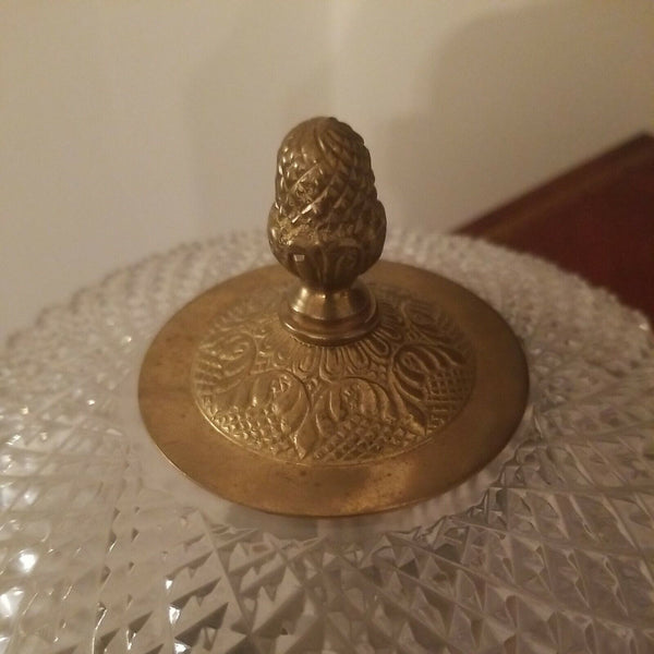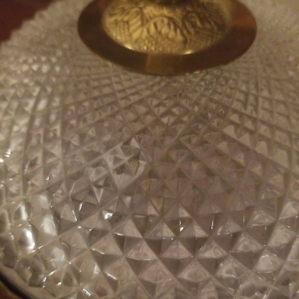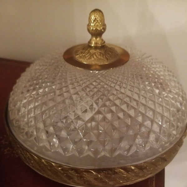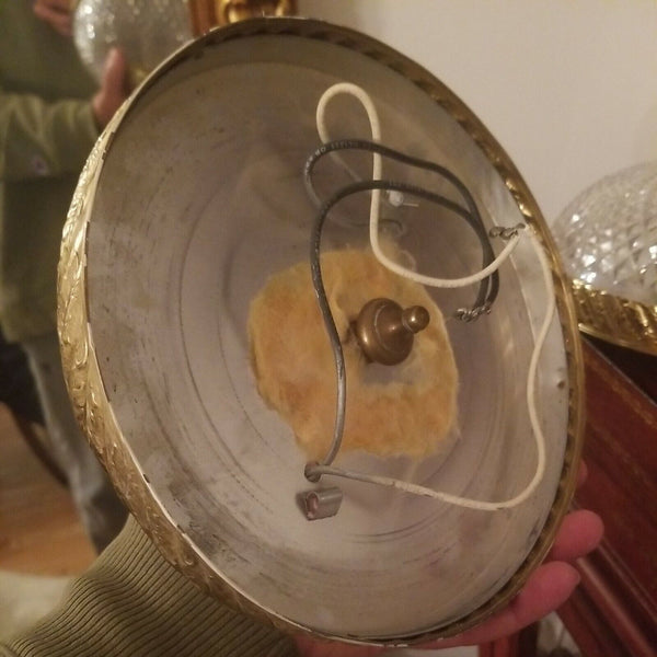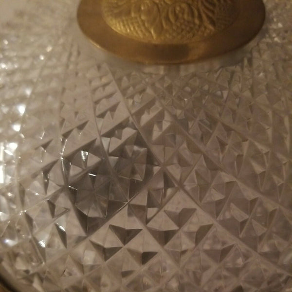 A rare pair of 1960's mid century Modern Hollywood glamor Baccarat crystal ceiling light fixtures measuring a desirable 8" diameter and about 5.5" tall to finial.  Diamond cut Baccarat crystal.  No breaks or cracks or chips.  Identical pair with original gold work and gilding with one light fixture having more tarnishing on the gold gilding as they were attached in a long Island gold Coast estate in different parts of the house so one fixture has more tarnisment, very minor and in fact gives it an antique look.  The crystal is brilliant and not cloudy and in mint condition.
