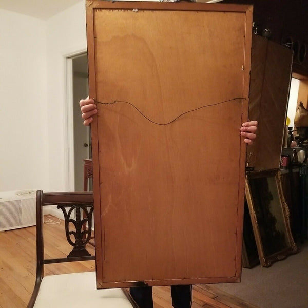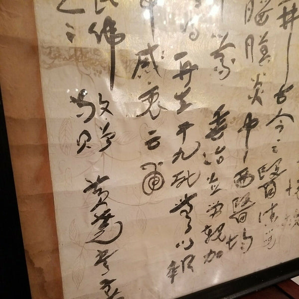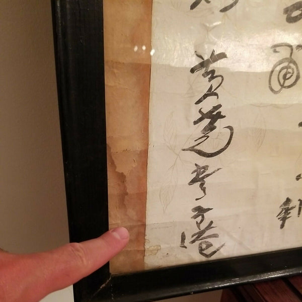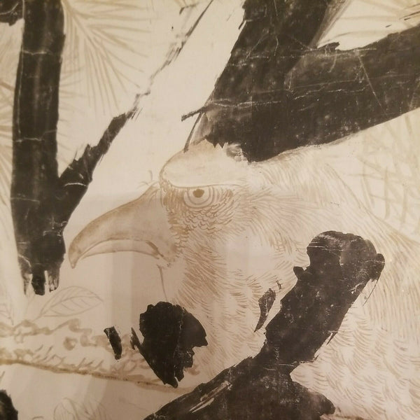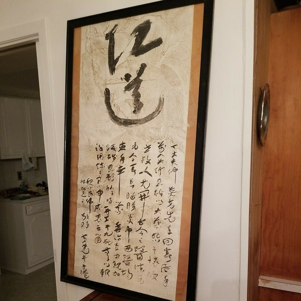 A very finely painted scroll all original hand painted Asian Chinese or other Asian with eagle birds painted in gold with Asian calligraphy writing. Very old and vintage guaranteed showing wrinkle marks and fold areas with what looks to be a scroll which was rolled originally and then framed sometime during the 1950's (the scroll itself is hand painted on paper and looks much older than 1950's.) Showing some stains on the lower part as I point to in one of my pictures. Fold marks and creases throughout. Measuring 45" tall by 25" wide.