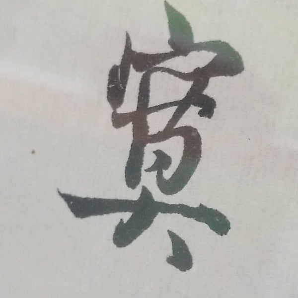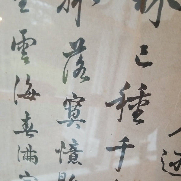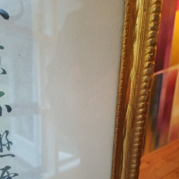 A fine Chinese hand painted framed Scroll in a gilt wood mid century frame. Vintage and hand painted. Stylized characters. Large size. Good condition but one minor fold mark on lower left about 2". Two small stains, Lower middle part. Other minor light paper creases/ fold mark consistent with age.