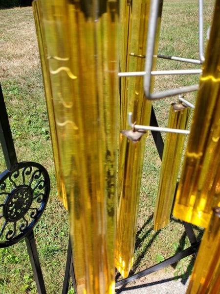A fine original crystal rewired mid century modern designer drop heavy prisim chandelier. This cubist deep honey color amber crystals all in good condition with an abstract sculptural body where each crystal hooks onto and sits hanging stylistically from this designer chandelier. Measuring 24 inches high and 18 inches wide. Note the original vintage chain adds another 20" to the height and it can be reduced or a longer chain can be deployed for various size interior design installations.