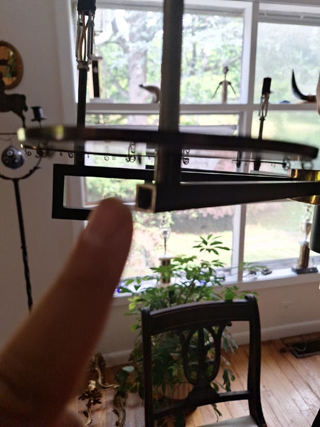 A vintage original 100% period correct mid century modern Designer chandelier acquired from a long island ny gold coast Estate probably attributed to Paul McCobb or other noteworthy mid century modern Designer. Extremely stylish and design worthy and timeless in style sophisticated and expensive quality construction. Solid and straight with 1950's cloth insulated wiring indicative of its quality. It may have had crystal prisms at one time but they are no longer there and it looks fine without them. Natural gilt gold discoloration and tarnish consistent with age and one design element under one branch only is missing as pointed to in one of the images. Not really noticeable. But it is certainly a flaw. Such chandeliers on high end decor websites like the dibs or chair ish go for $5000 to $20,000. This needs tlc but viable and just as good with proper candle sleeves and hung and lit. Sophisticated, goes with: