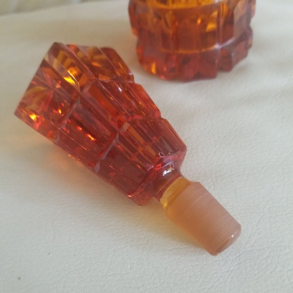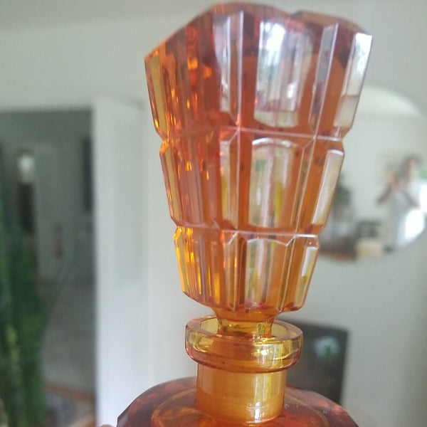 A rare Amber Thick crystal mint condition perfume Bottle nice and heavy with deep Cubist squares and a diamond cut top design on the original stopper. A wonderful honey color amber glass brilliant and clear never used nos new old stock from 1950's. Antique original label. No chips cracks or restorations no breaks. No scratches. Even the stopper is magnificent. The best perfume Bottle.