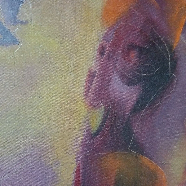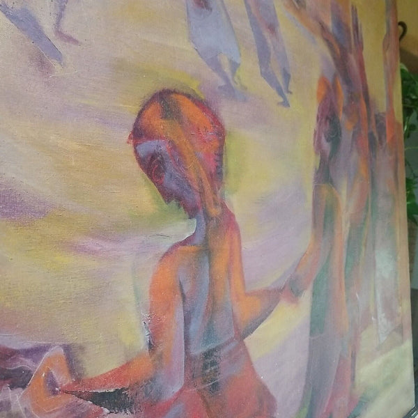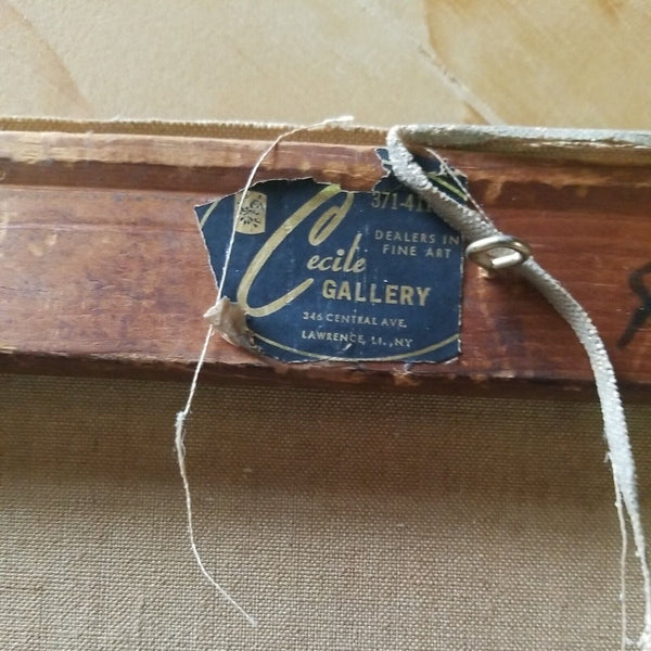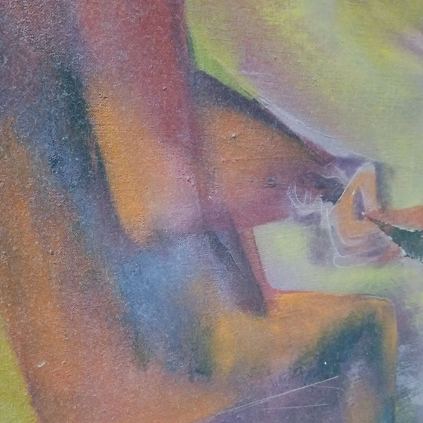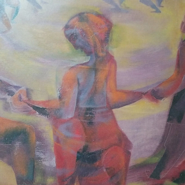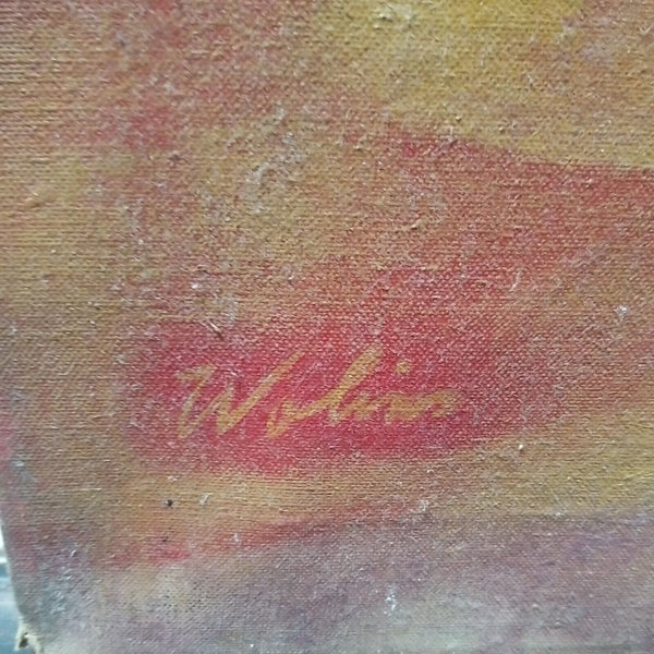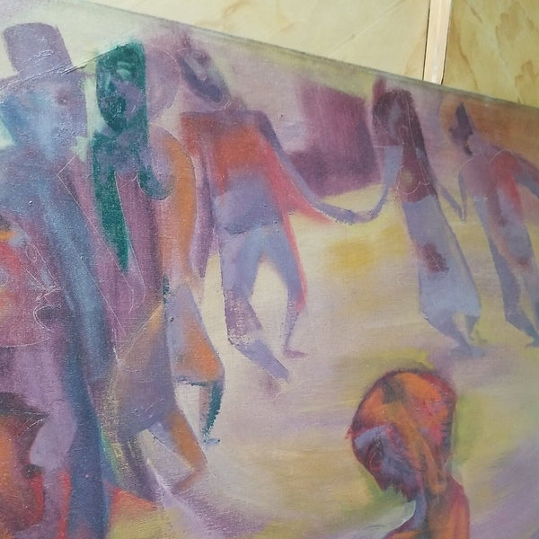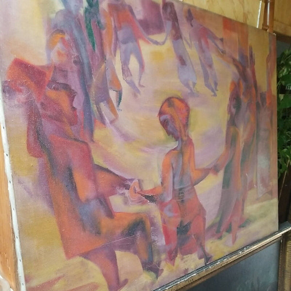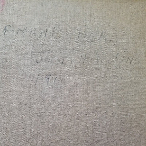 A fine impressionist Picasso inspired Judaica painting by Joseph Wolins signed and titled Grand Hora. A very rare color of Magenta with pastels. Various Cubist abstract impressionist figures. Good overall condition, with a Small patch repair on the back of the original canvas as I point to in one of the pictures, not noticeable from front. Has Cecile Gallery of NYC label on back as well as a gallery price tag of $2500 on back stretcher.