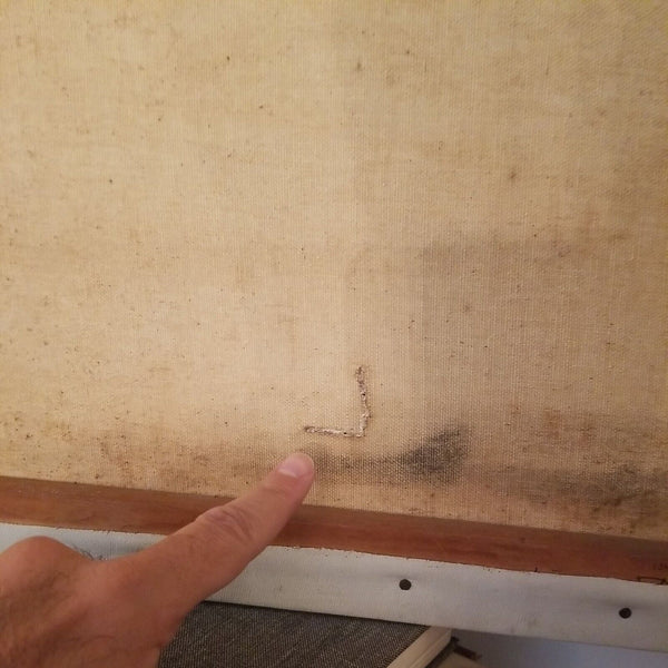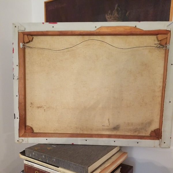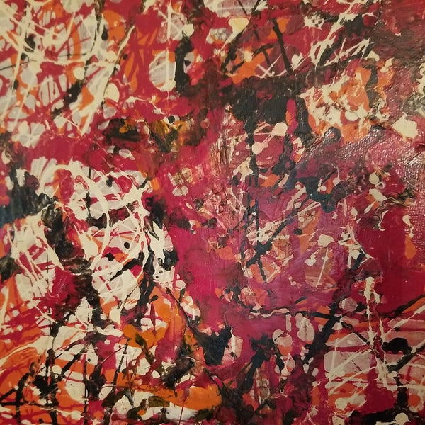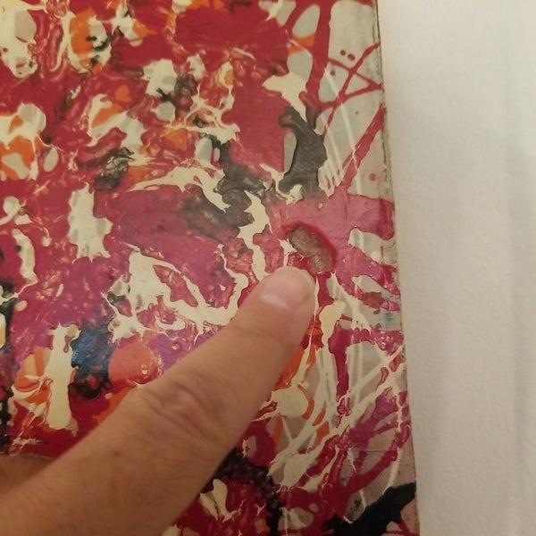 A mid century Modern original 1950's hand painted abstract oil painting in the manner of Jackson Pollock. Really stylized like the master works in museums. Superb execution. Paint applied in the highest form of abstraction. Old Small repair in back as I point to in my images. A half inch paint loss area also pointed to in another photo.