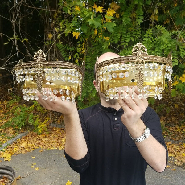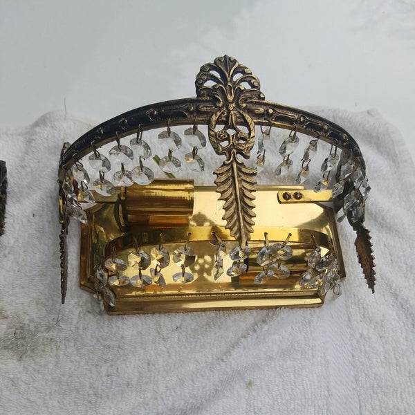 Antique pair of original French sconces/ wall lights with empire motif and fine crisp casted bronze applications. Naturally aged consistent with being over 80 years old with gilt gold patina being tarnished and the background having an antique patina wonderfully tarnished and showing wear and antique spotting, desirable in a true antique sconce. No breaks or restorations. Original gold patina. Wonderful in every way. Selling for much more by decorators.