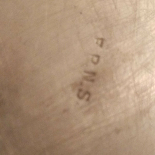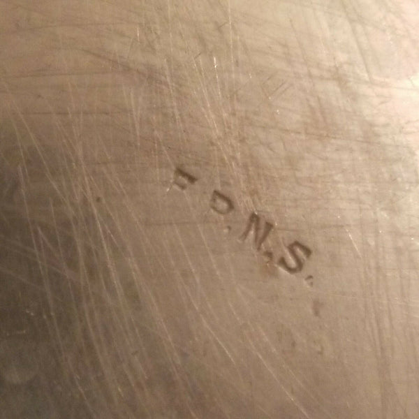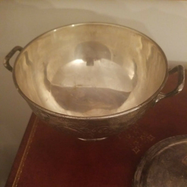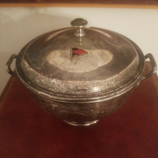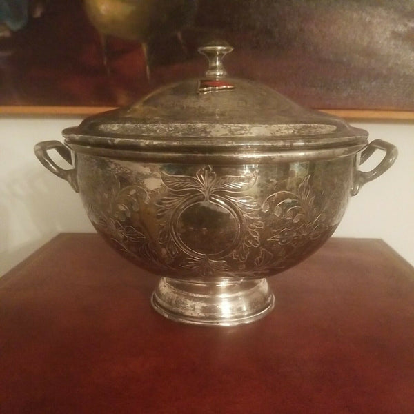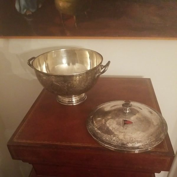 A large vintage centerpiece trophy cup of an important yachting competition having a stylized art deco enamel flag and the inscription "member member runner up 1974". Wonderful hand etched deep floral patterns on the body of the cup with 2 unengraved empty medallions on the front and back of the cup. Embossed impressed letters on the bottom shown in one of the images indicating antique provenance. No dings cracks or damages. Heavily tarnished, fresh out of an estate on the gold coast of Long Island, home of the Hamptons and its super rich yacht owners.